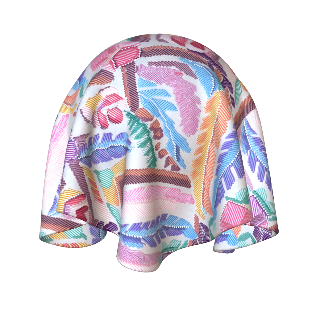Vibrant and detailed embroidery design. The pattern features colourful, stylized feathers and floral elements arranged in a symmetrical and geometric layout. The embroidery is executed using satin stitches, with colours including shades of pink, purple, blue, green, orange and yellow. The background fabric is a neutral beige which contrasts with the bright, bold colours of the threads. High level of craftsmanship in the arrangement and execution of the pattern, inspired by traditional, folk art textile design.